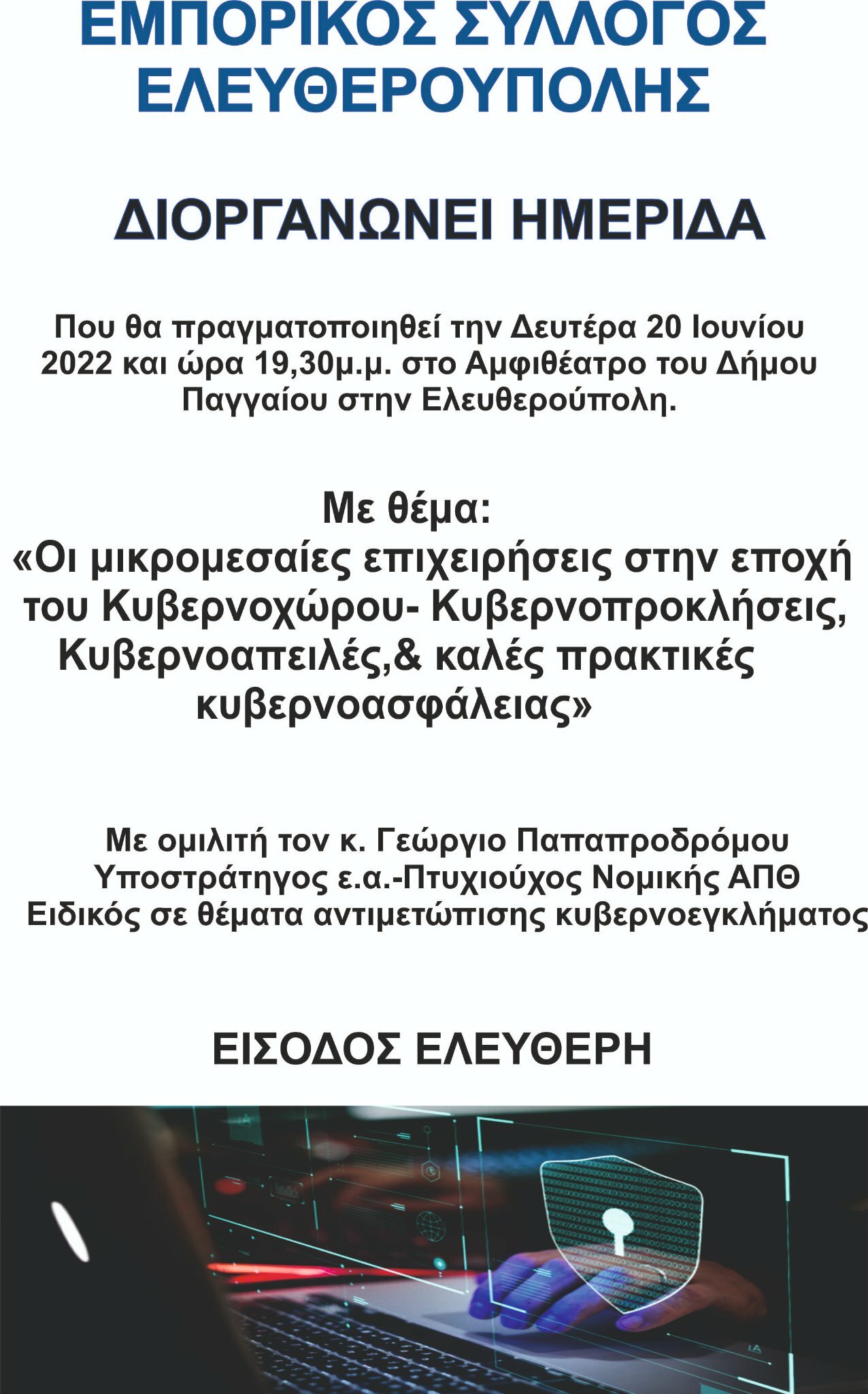 Εκδήλωση από τον Εμπορικό Σύλλογο Ελευθερούπολης ΔΕΥΤΈΡΑ, 20 ΙΟΥΝΊΟΥ 2022 ΣΤΙΣ 7:30 Μ.Μ. – 10 Μ.Μ.